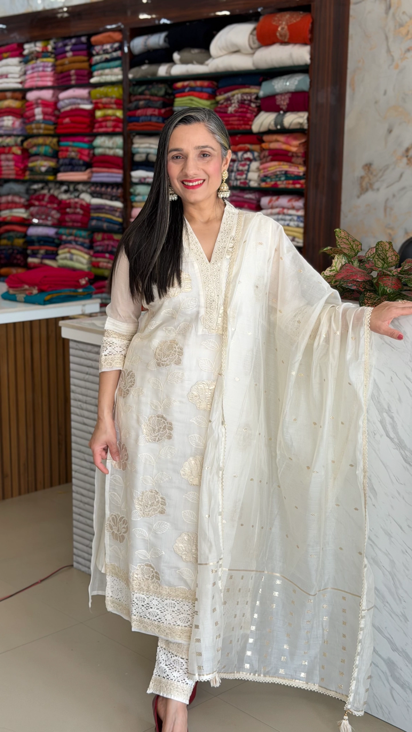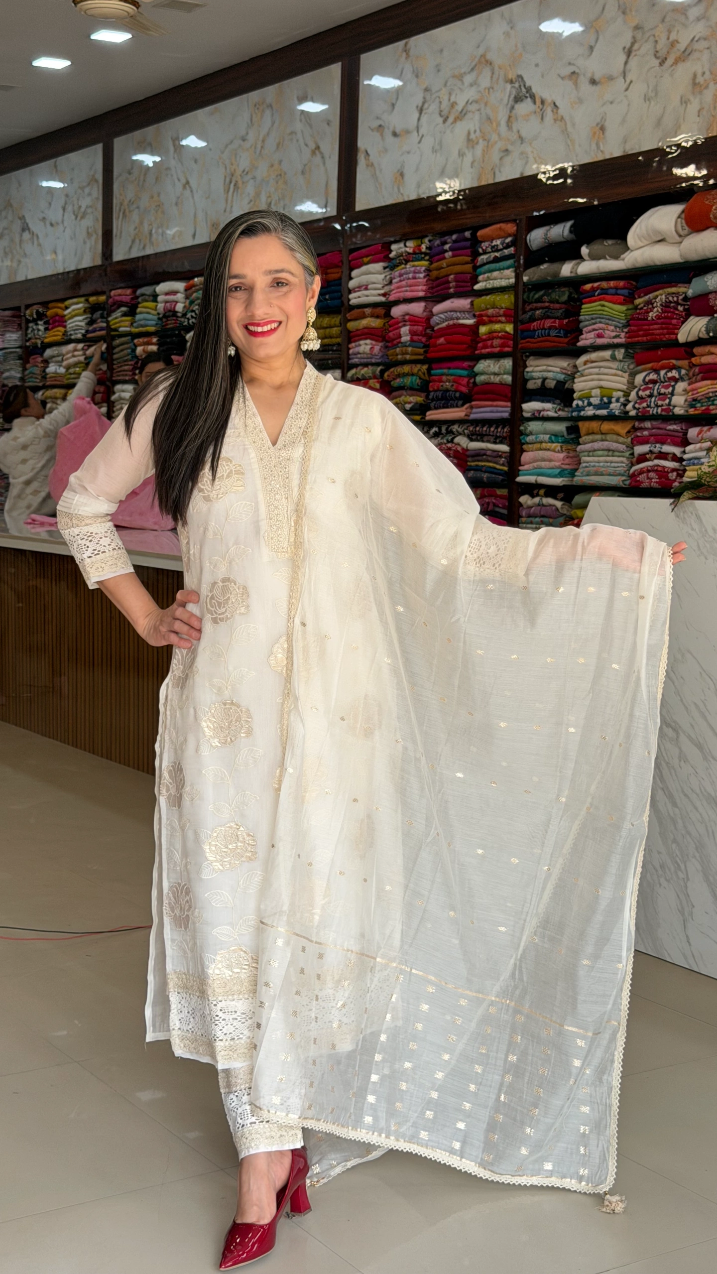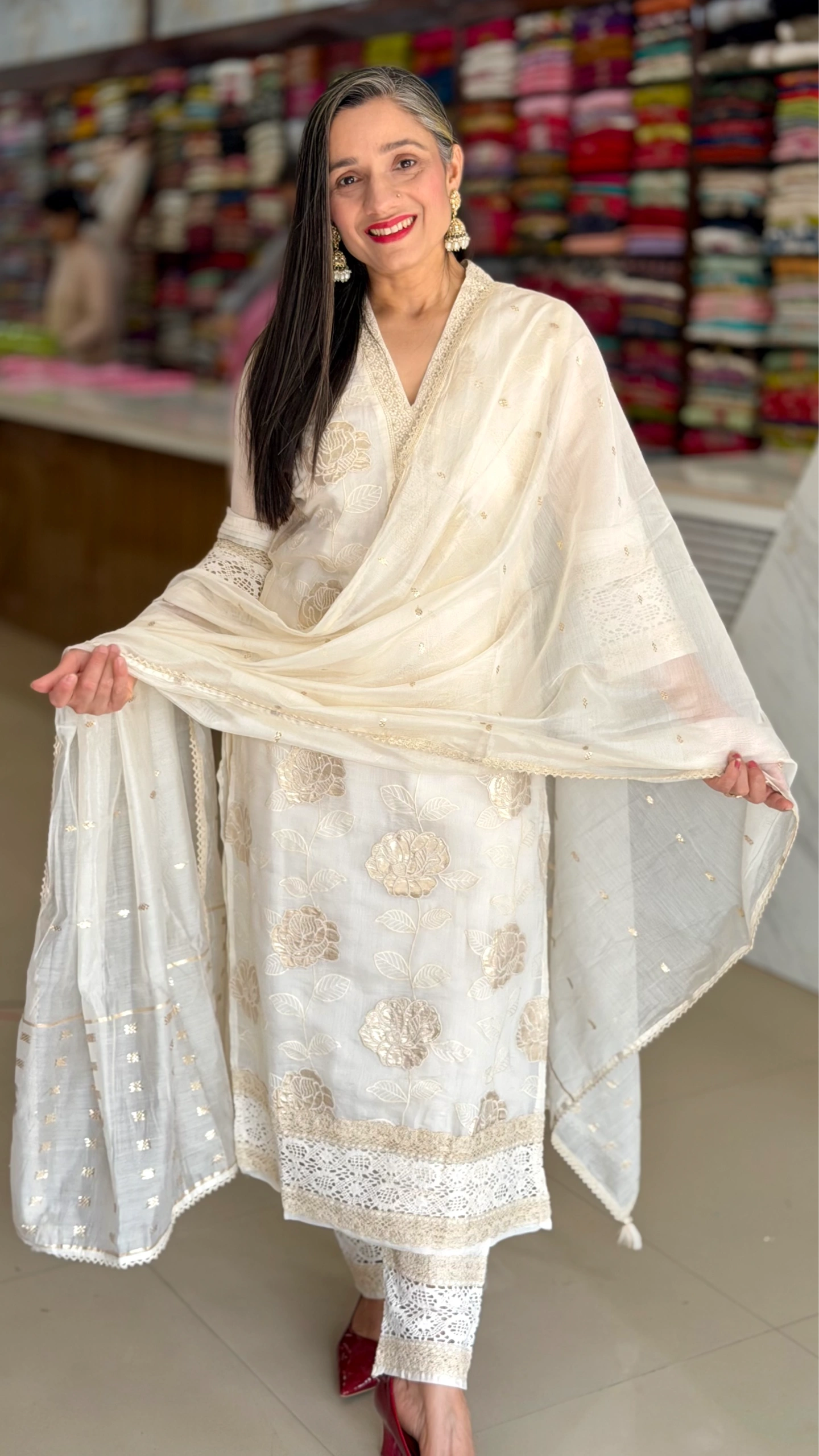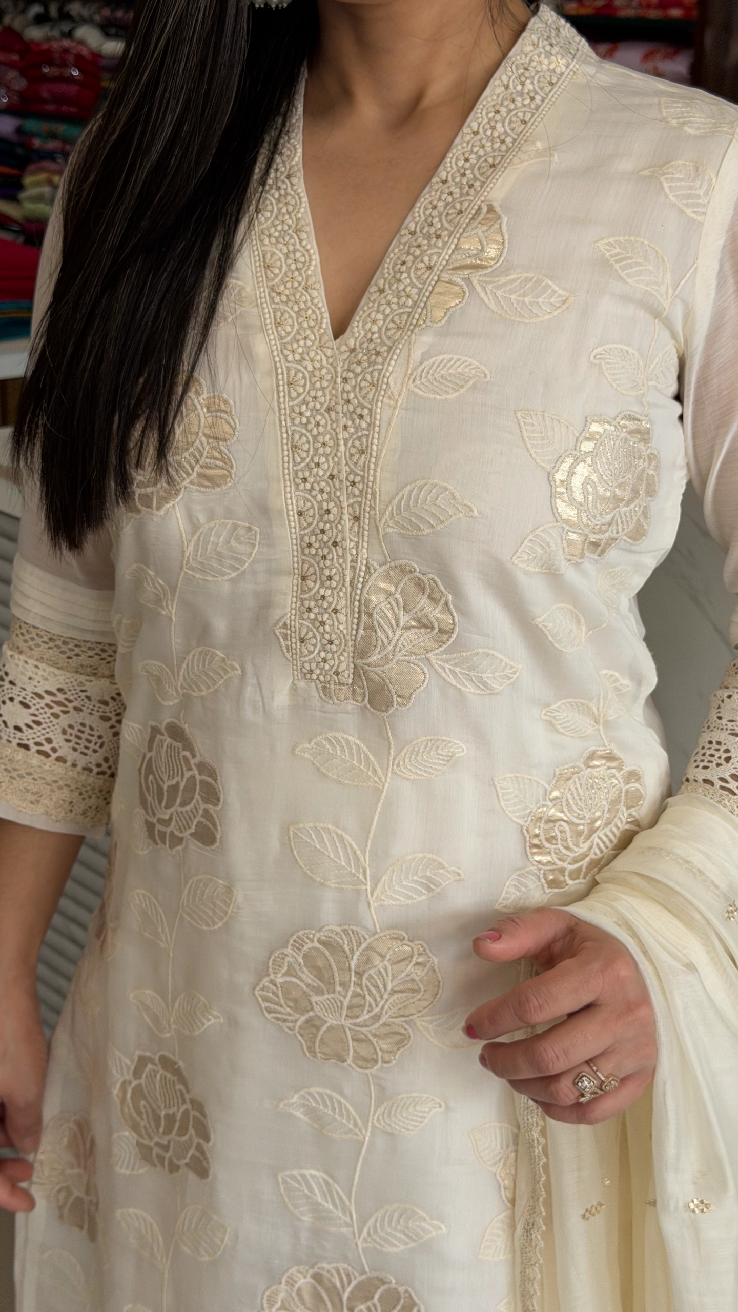The kurta features intricate floral embroidery work that enhances its richness, while the lightweight, flowy dupatta with subtle golden accents adds charm and movement to your overall appearance. Perfect for weddings, receptions, festive gatherings, and special occasions.