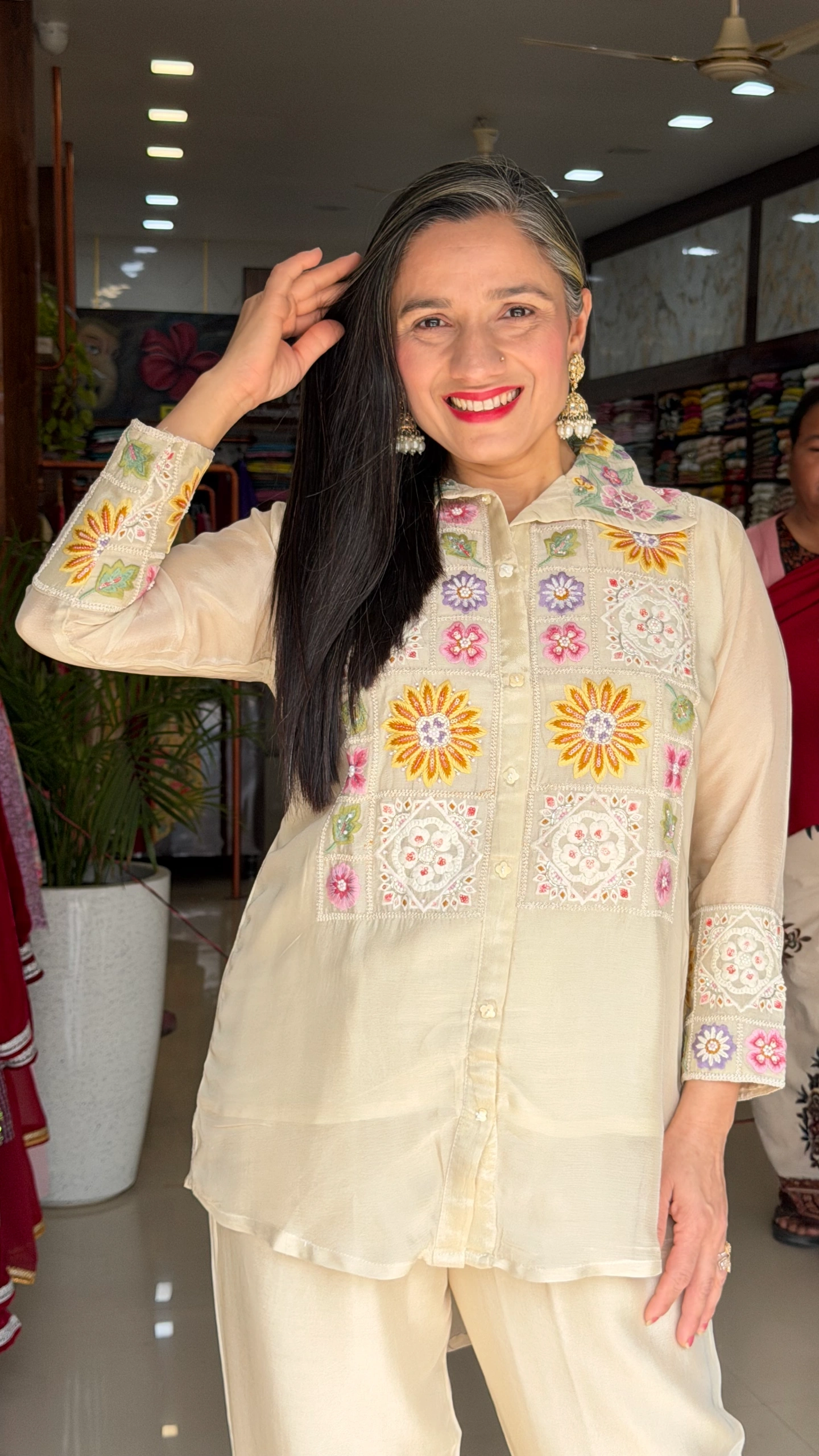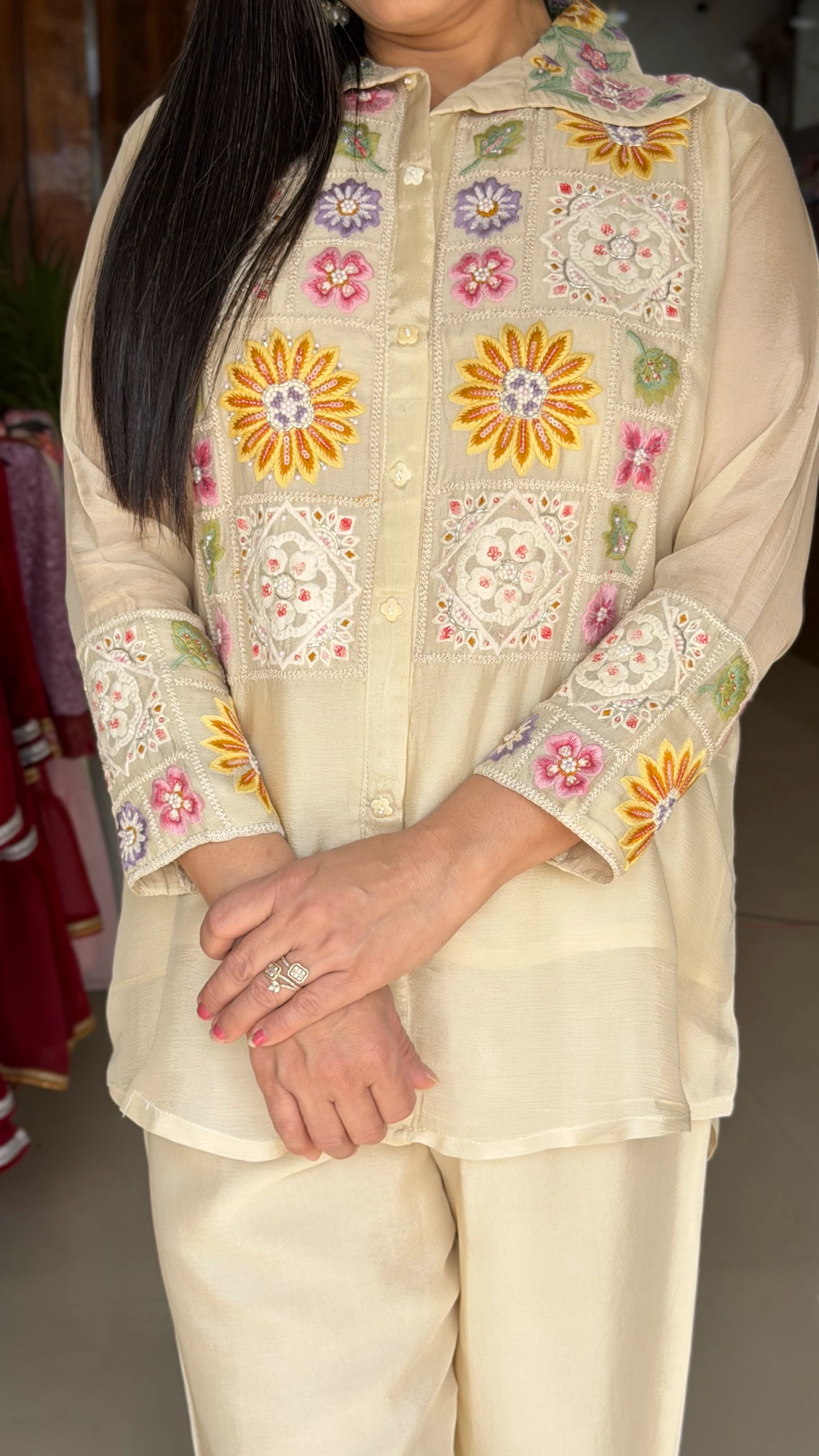 Elevate your ethnic style with this premium cream Chinnon embroidered coord set. Designed with intricate multicolor floral embroidery on the top and pants, this elegant outfit is perfect for festive wear, parties, and special occasions.