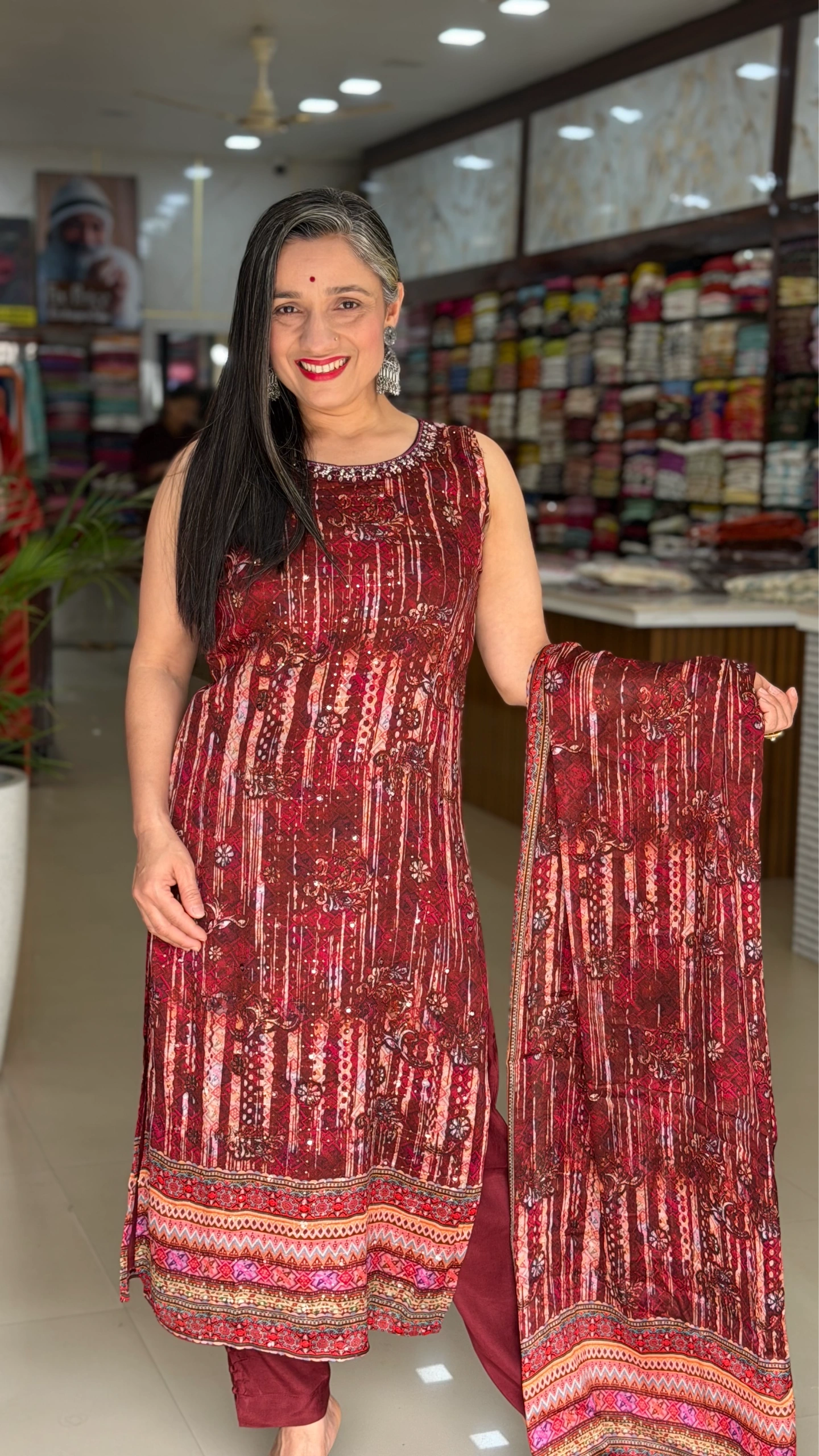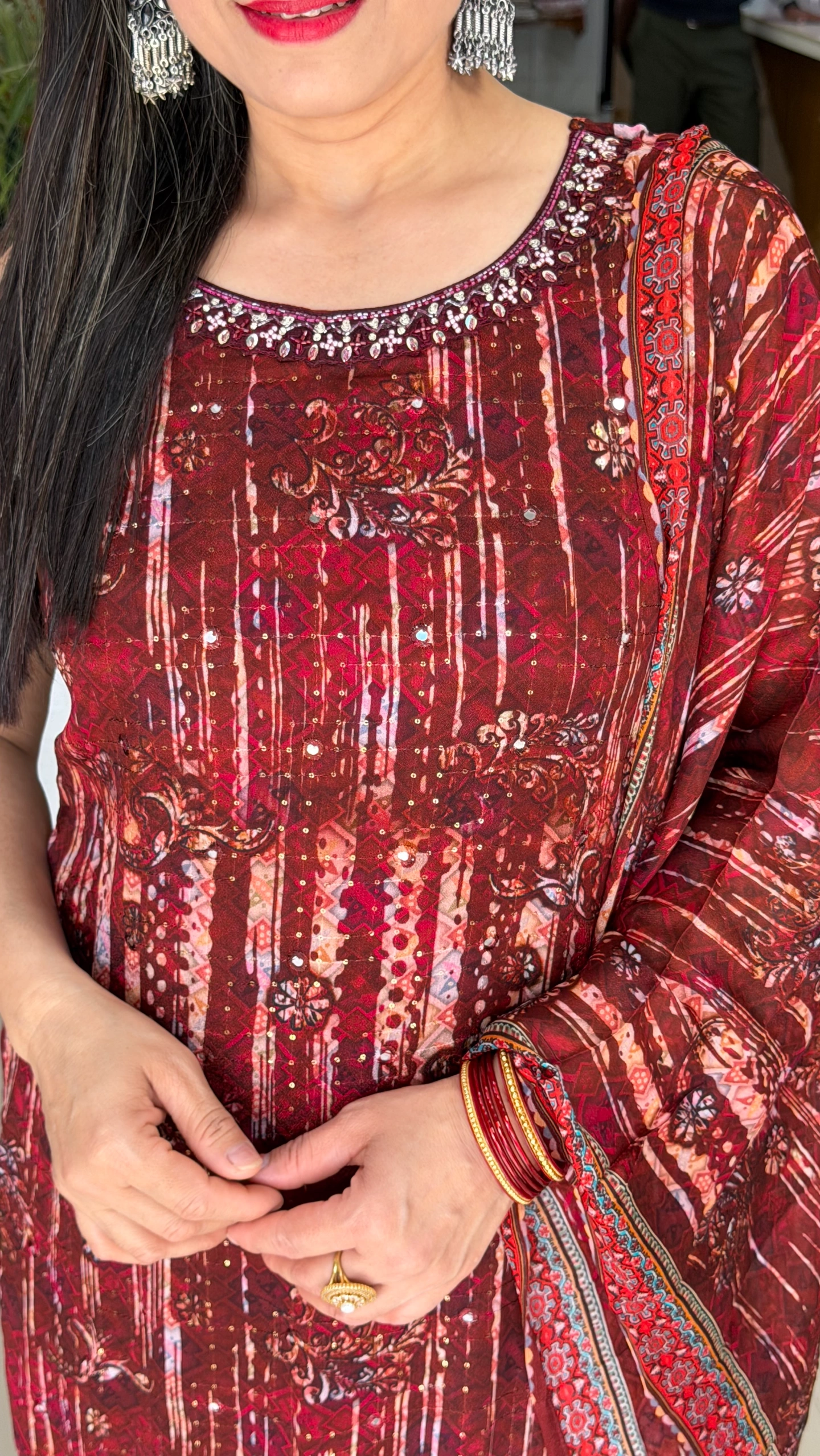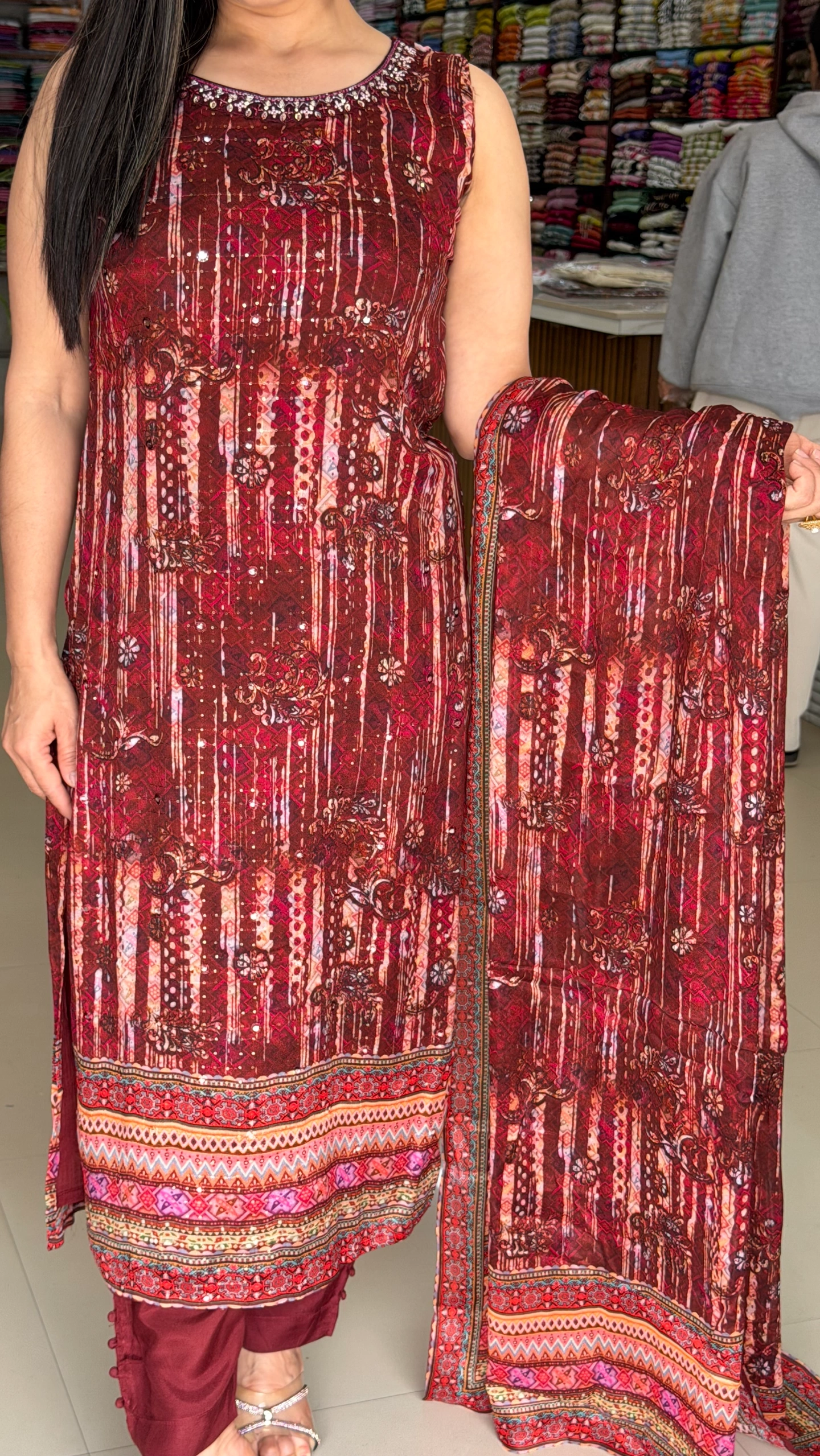 Elevate your festive and party look with our stunning Maroon Chinnon Party Wear Set, designed to make you stand out with grace and elegance. Crafted from premium-quality chinnon fabric, this set offers a soft, flowy texture with a luxurious finish.
