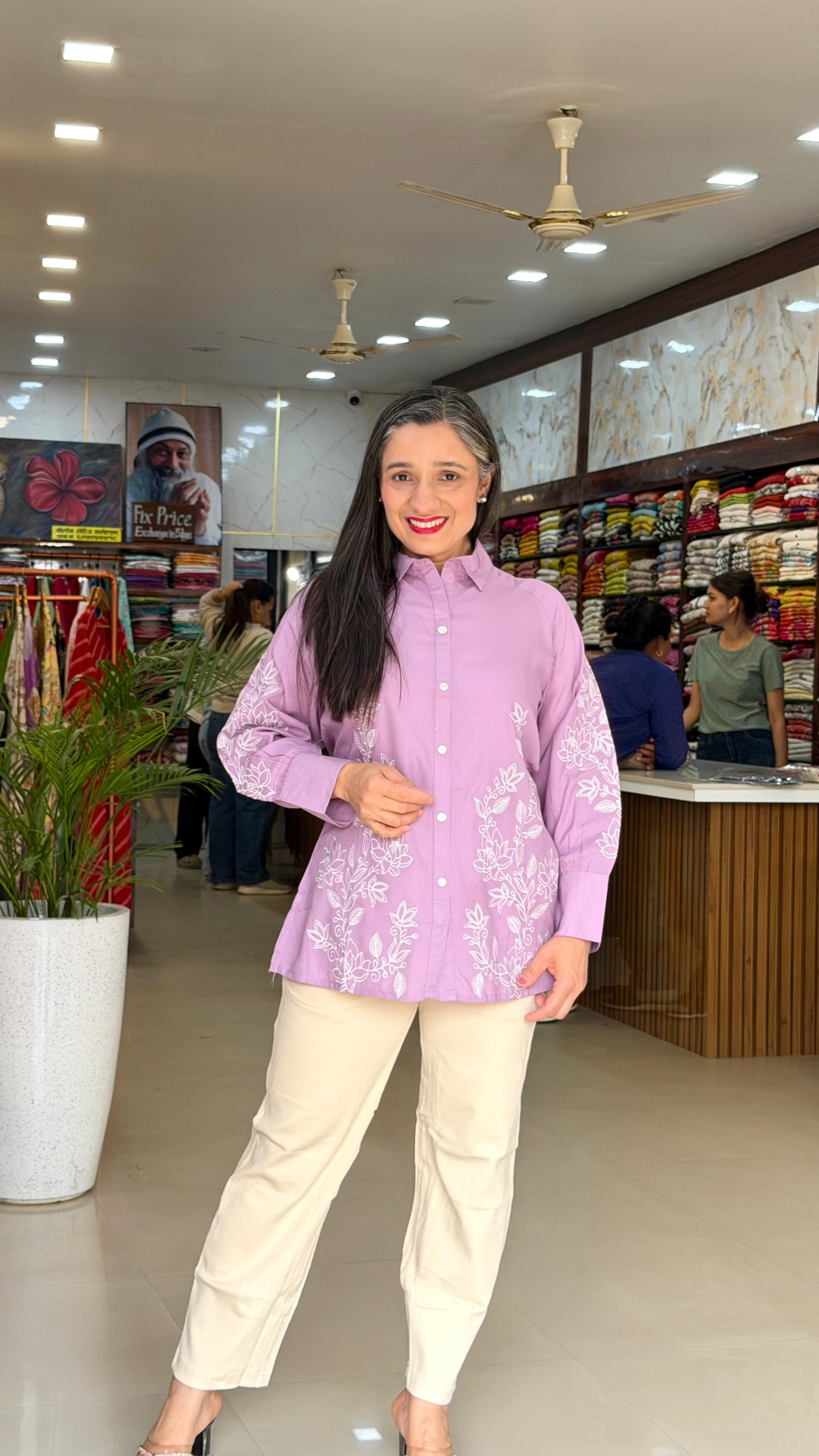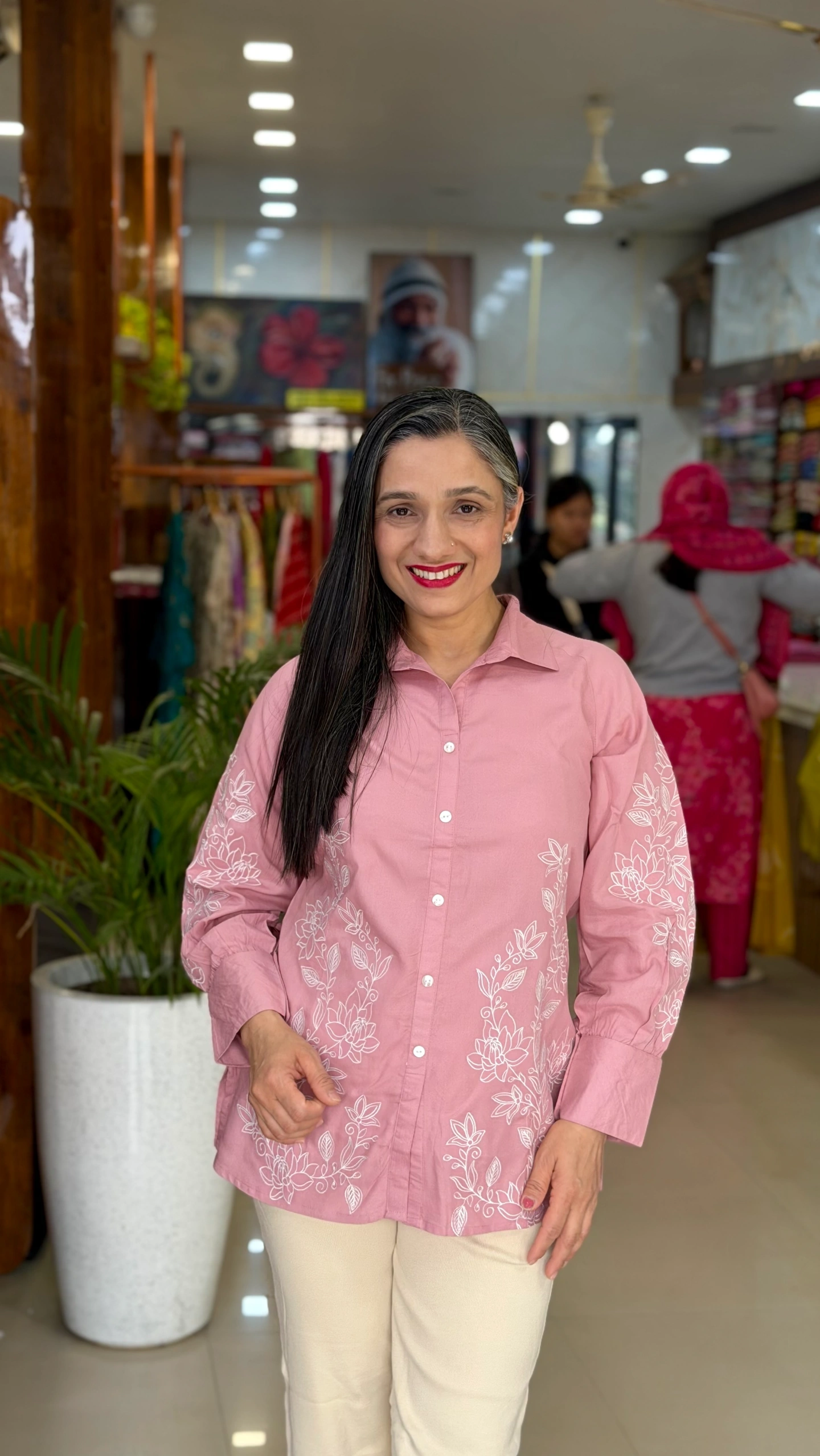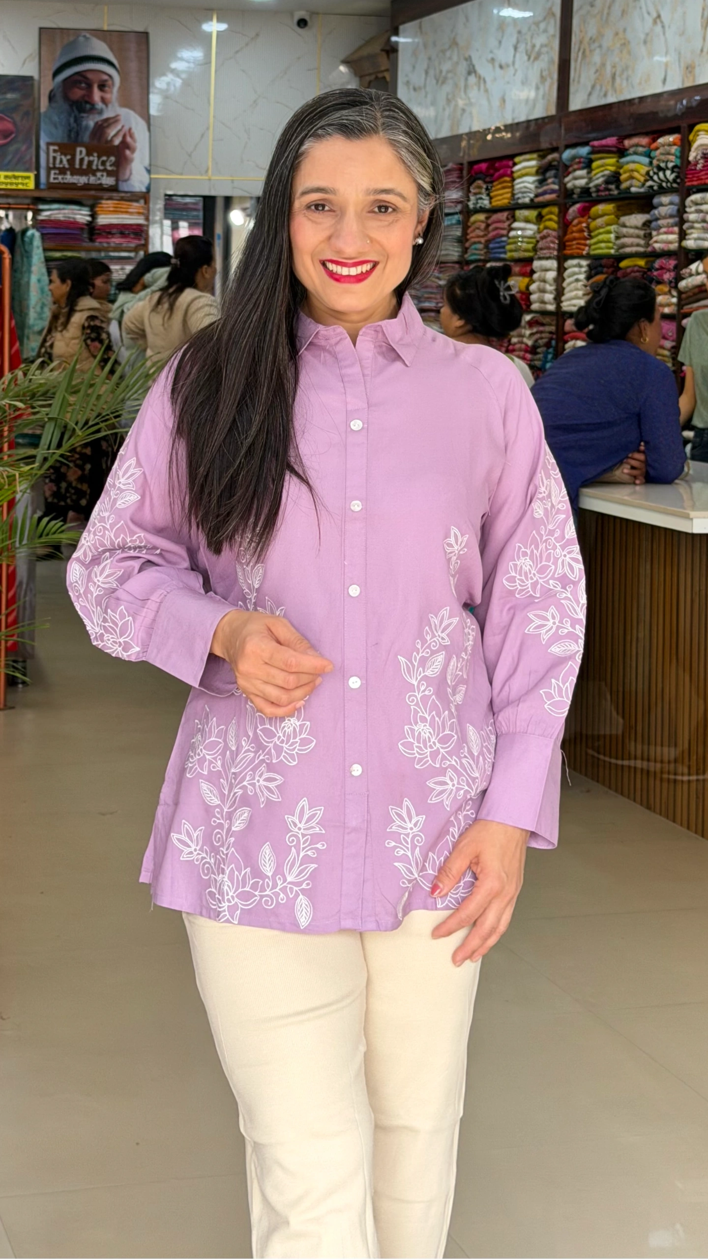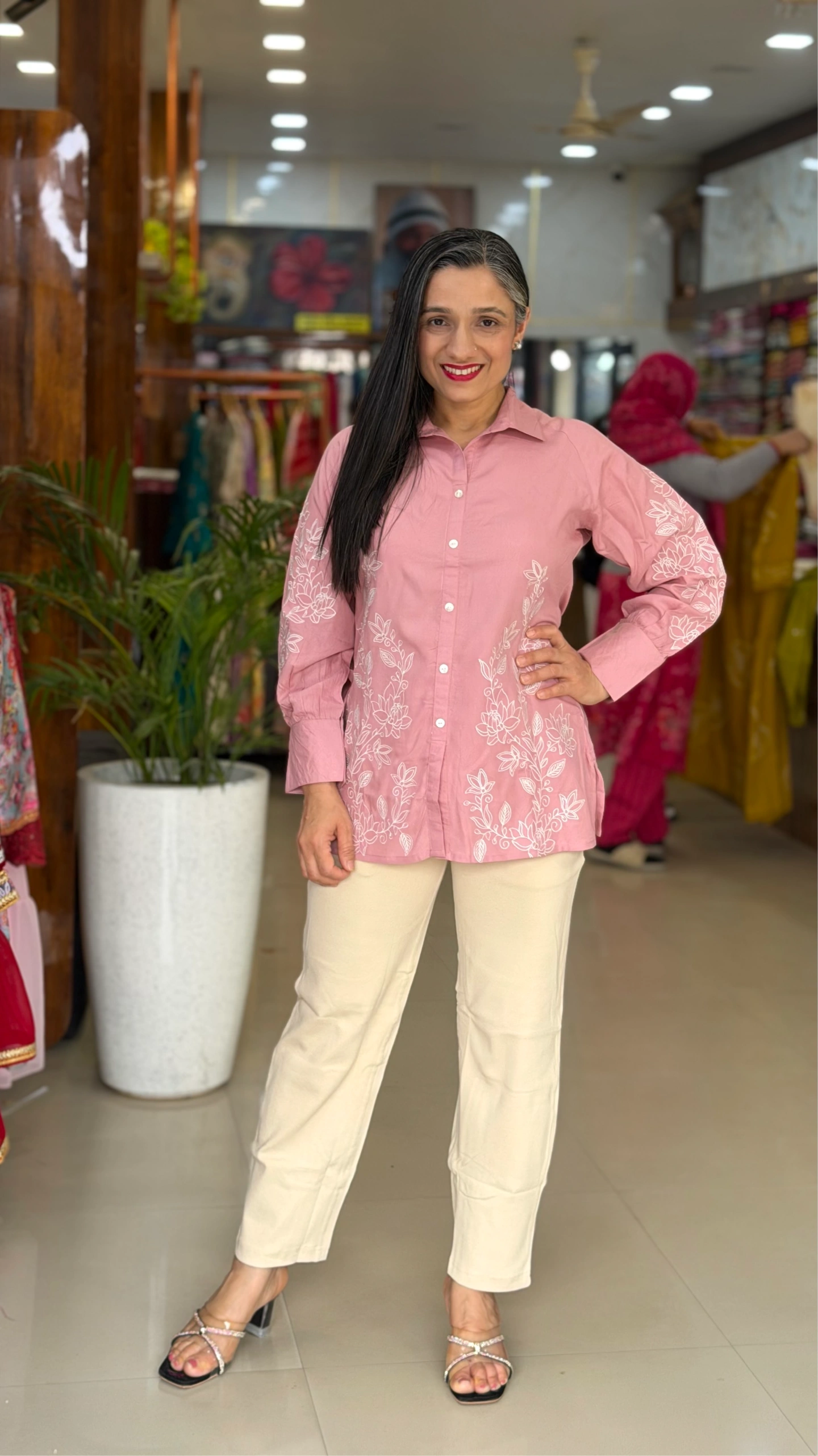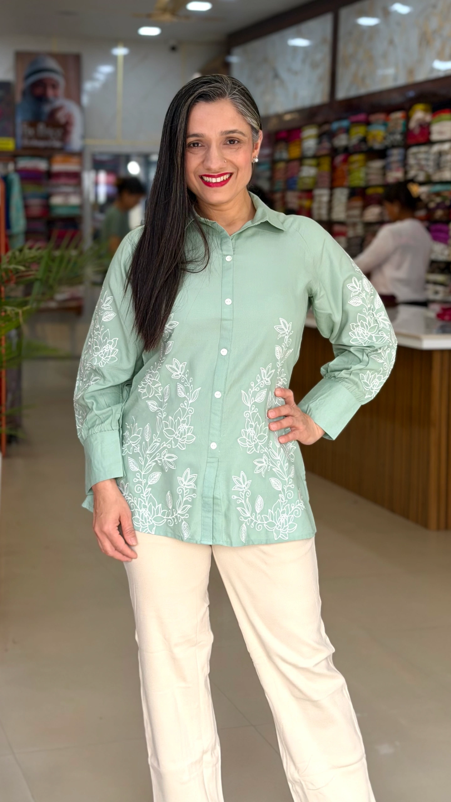 The top features intricate white floral embroidery on the front and sleeves, adding a graceful feminine touch. Designed with a classic shirt collar and front button closure, it offers a smart yet relaxed silhouette that flatters all body types.